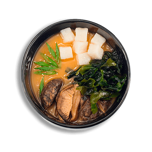 Мисо бульон, тофу, грибы шиитаке, водоросли вакаме, лук зелёный