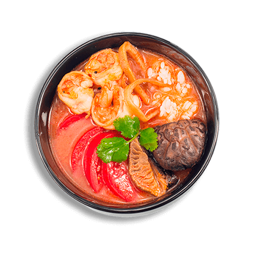 Бульон том ям (острый), креветка, кальмар, грибы шиитаке, черри, рис, лайм, кинза